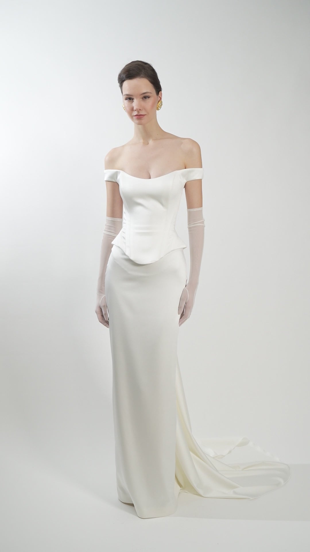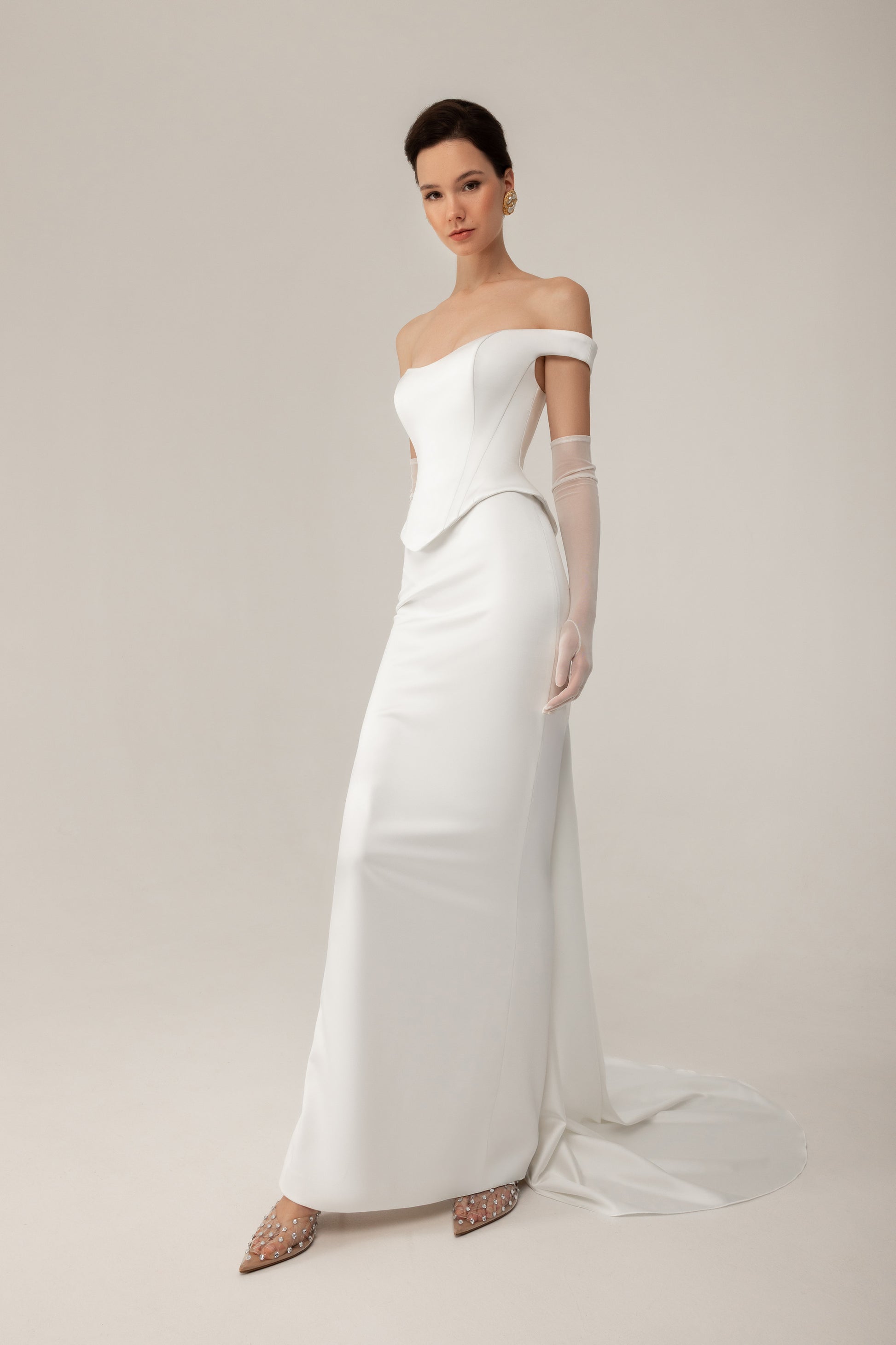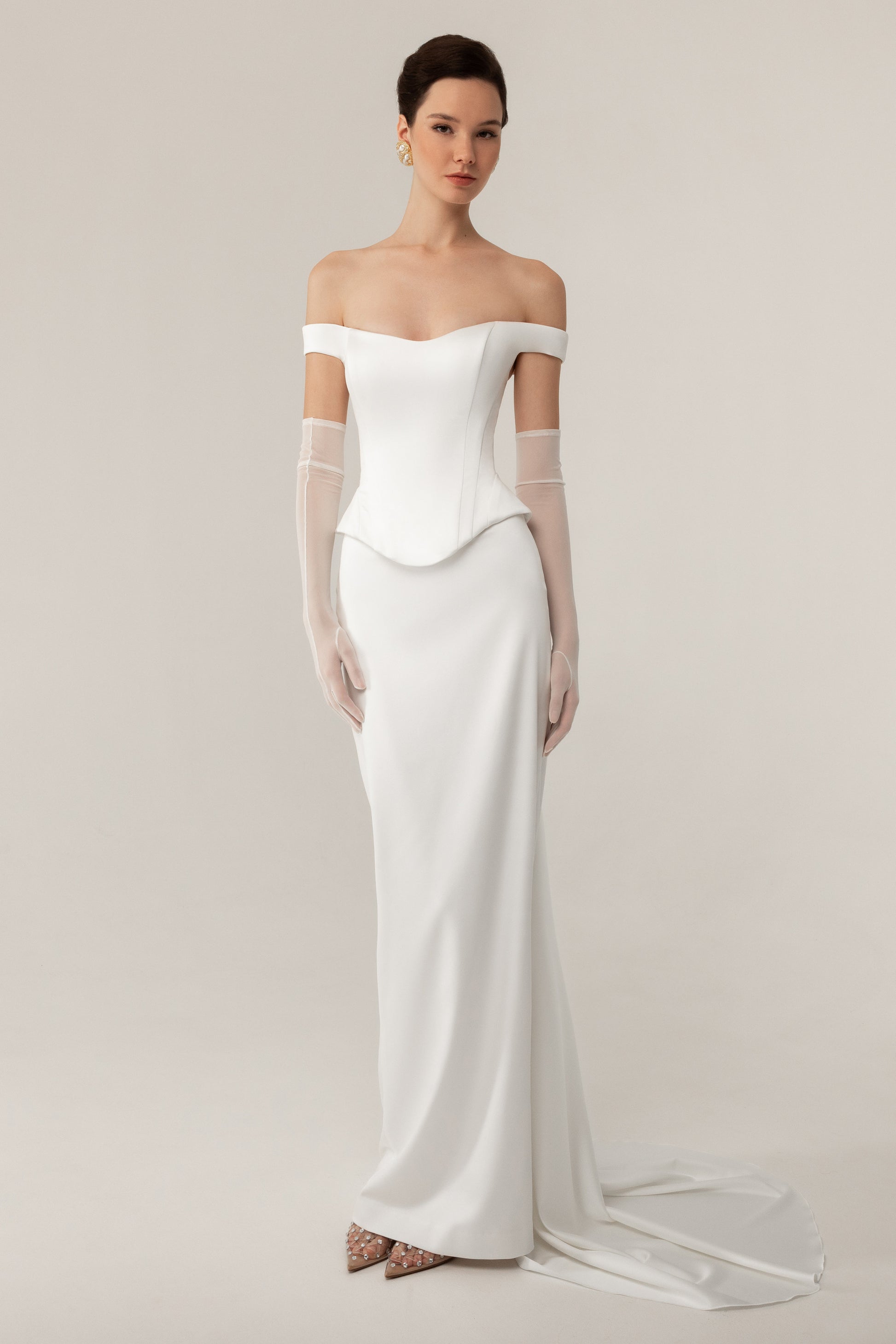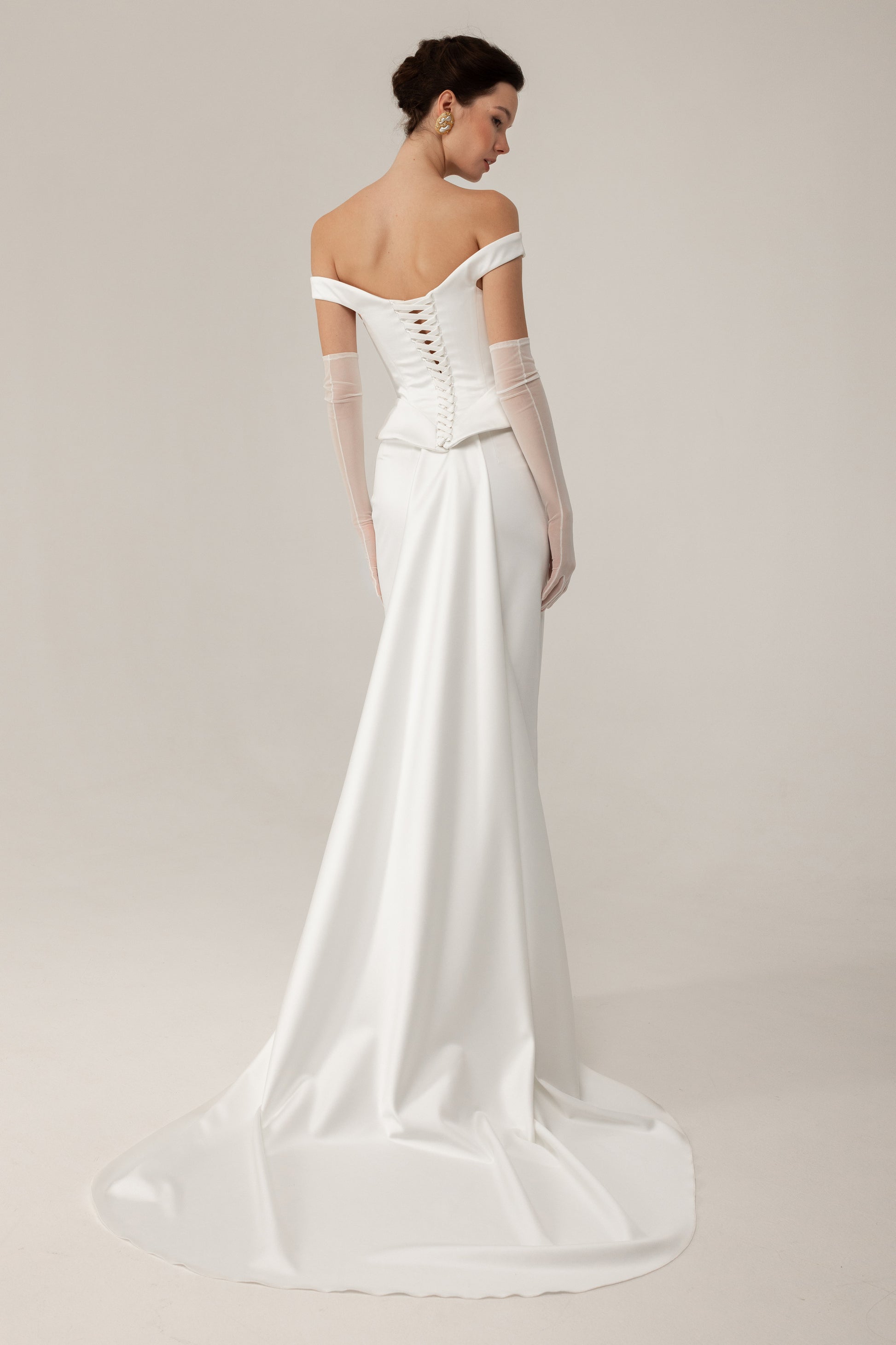 Designed as a two-piece bridal ensemble, it features a sculpted off-the-shoulder satin corset and a sleek stretch satin skirt that drapes effortlessly, creating a flawless, elongated silhouette.