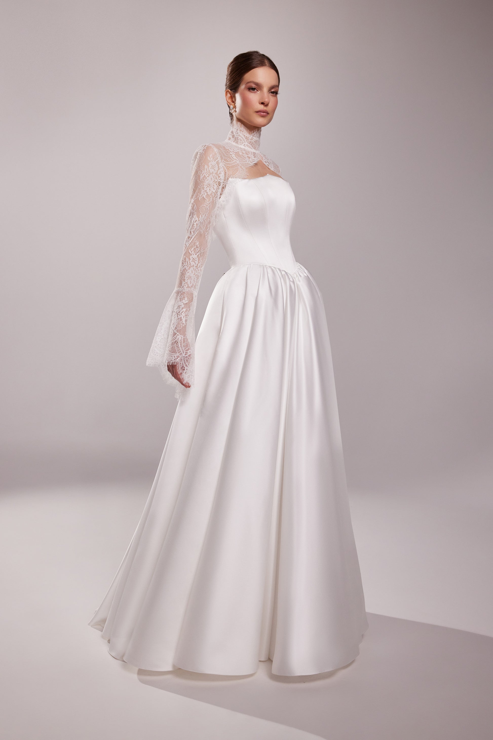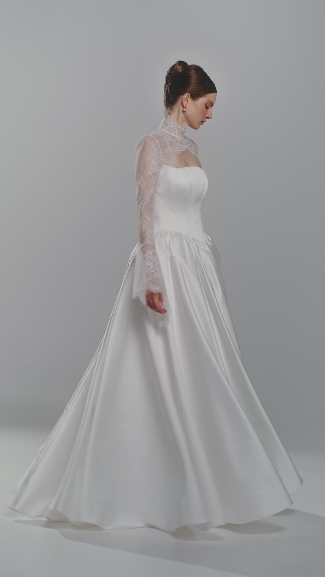 White Satin Drop Waist Wedding Dress Tessa | Corset Bridal Gown with Lace Bolero
